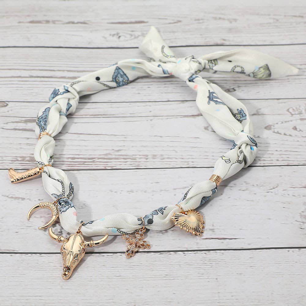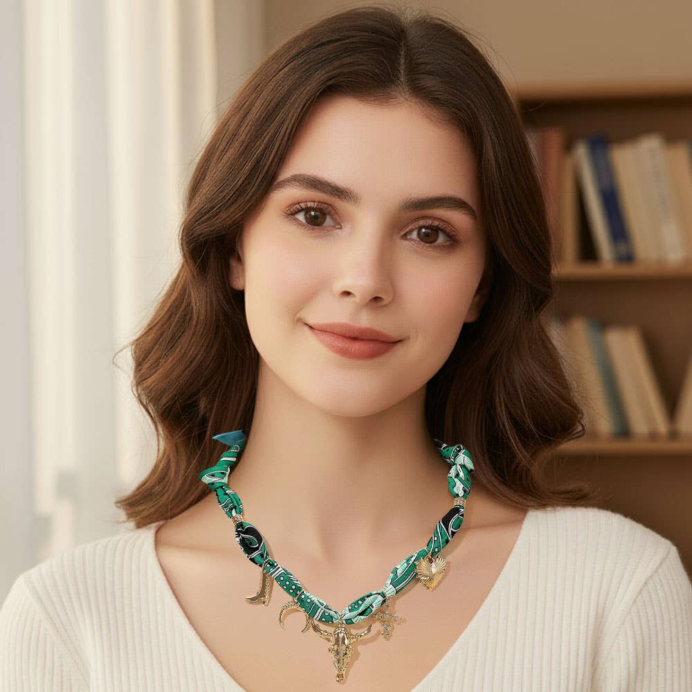 Make a stylish statement with this scarf necklace featuring Western-inspired charms. Accented with symbolic details like a bull head, crescent, and heart, this versatile accessory blends chic design with rustic flair, perfect for adding personality to any outfit.